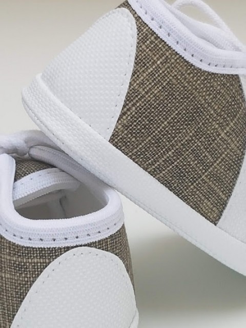 Zostały wykonane z jensu w kolorze oliwkowym. Noski oraz zapietki w kolorze białym.