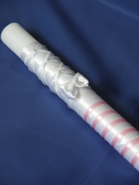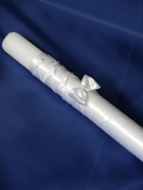 Elegancka biała Świeca do Chrztu lub Komuni Świętej, ręcznie zdobiona atłasową wstążką i maleńkimi perełkami.