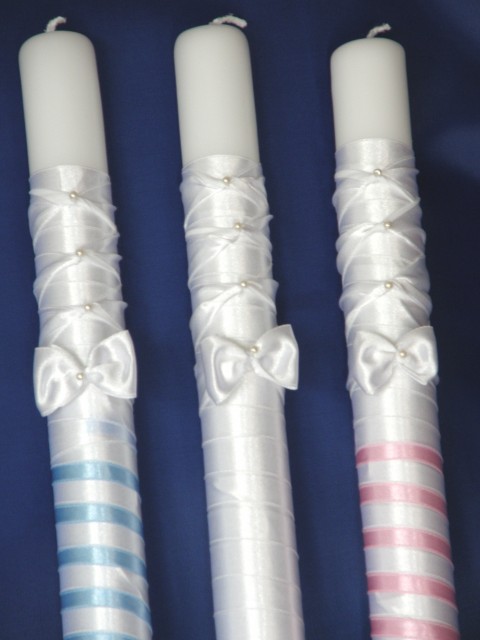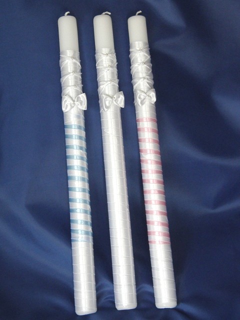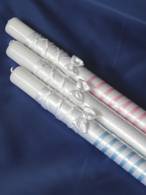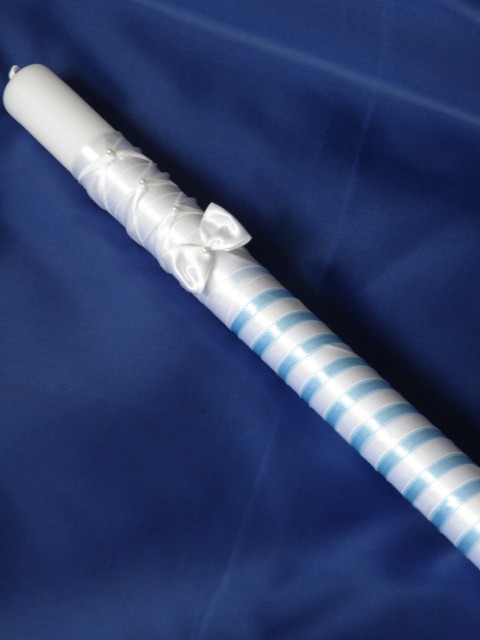 Elegancka  Świeca do Chrztu lub Komuni Świętej, ręcznie zdobiona atłasową wstążką ze złotym brz..