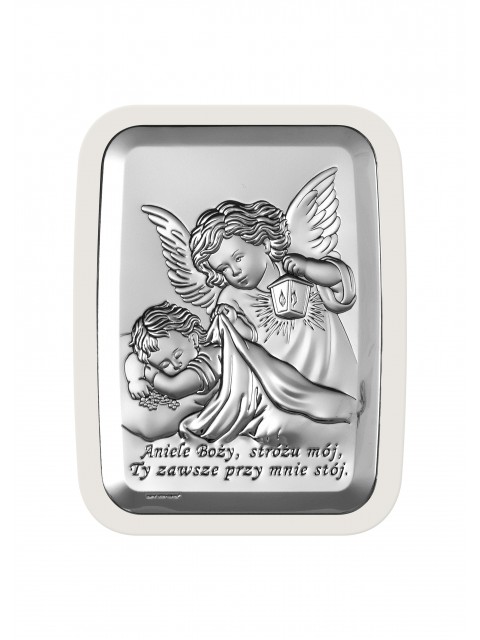 Elegancki, srebrny obrazek w kształcie prostokąta z zaokrąglonymi rogami, w rozmiarze 11 cm x 15 cm, przestawiający Anioła Stróża z latarenką, opiekującego się śpiącym dzieckiem, z modlitwą "Aniele Boży".