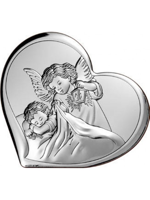 Srebrny obrazek w kształcie serduszka przedstawiający Aniołka z Latarenką przy śpiącym dziecku.