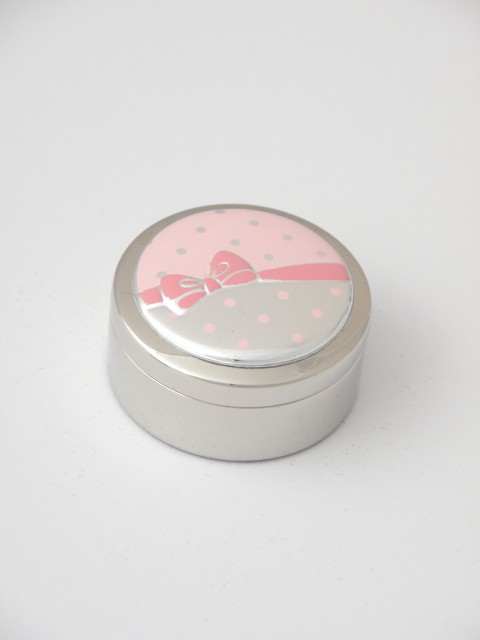 Na pudełku malowana kokardka w kolorze różowym. W środku wyłożone białym materiałem.