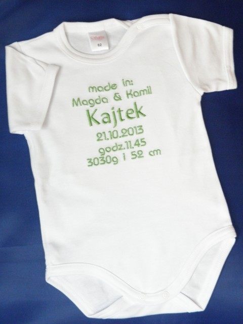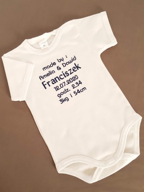 Bawełniane body z krótkim rękawem renomowanej polskiej firmy Sofija z wyhaftowaną metryczką dziecka.