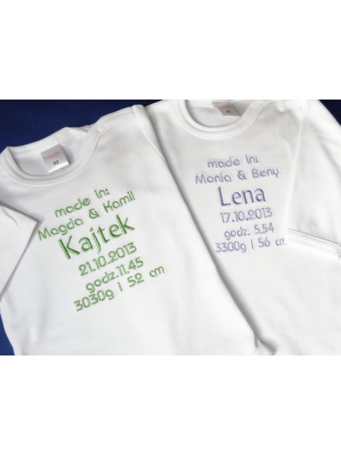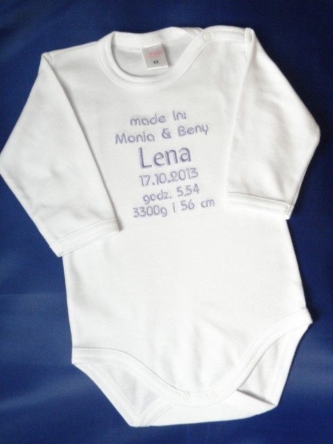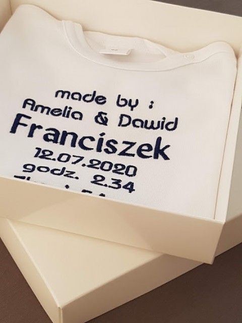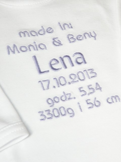 Haft wykonywany jest na zamówienie w naszej pracowni, z największą starannością o jakość wykończenia oraz wygodę i bezpieczeństwo dziecka. Dlatego na wewnętrznej stronie haft zabezpieczony jest flizeliną do wyrobów dziecięcych. Dzięki temy haft nie bedzie drażnił brzuszka najmłodszego członka Twojej rodziny.
