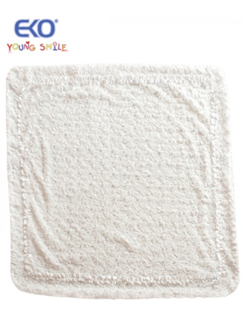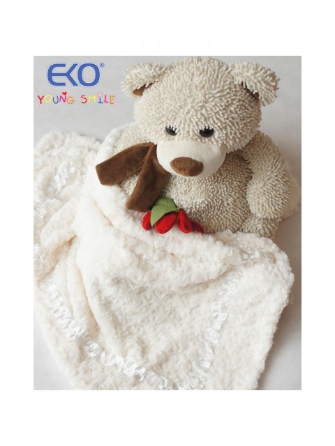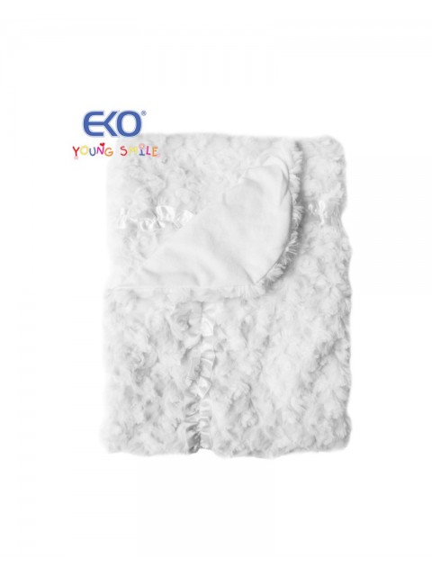 Uroczy, cieplutki biały kocyk wykonany z dzianiny futrkowej układającej się w kształt różyczek,