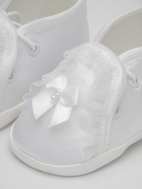 Atłasowe buciki, w kolorze białym, wiązane.