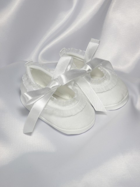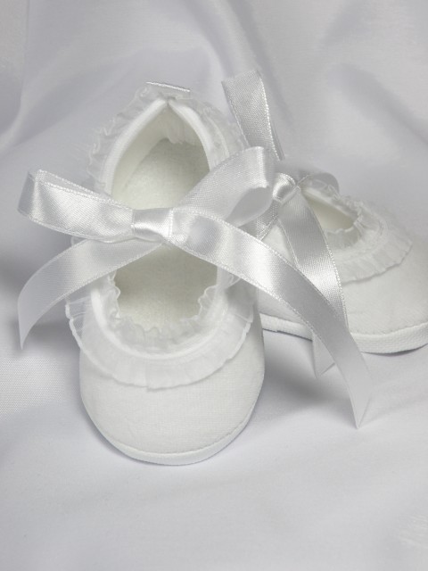 Białe welurowe pantofelki, wiązane atłasową wstążką, ozdobione szyfonową falbanką.