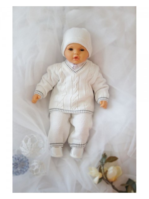 Dzianinowy komplet do chrztu dla chłopczyka w kolorze białym -brzegi sweterka i spodni popielate: