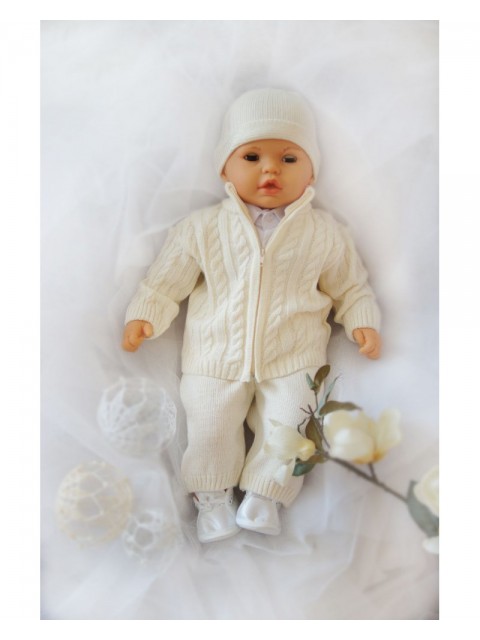 Ciepły dzianinowy komplet do chrztu dla chłopczyka w kolorze ecru .