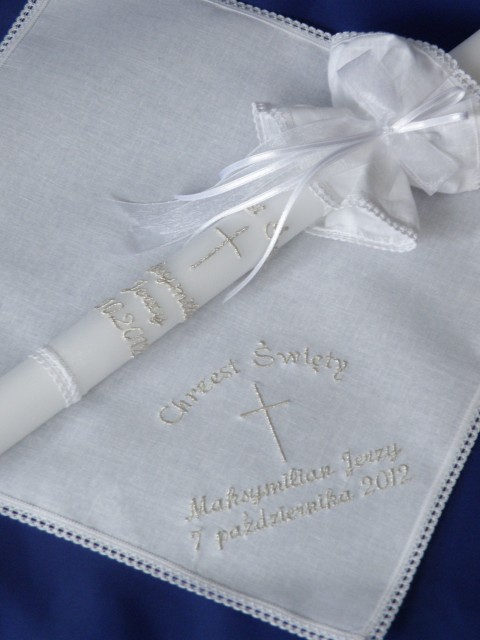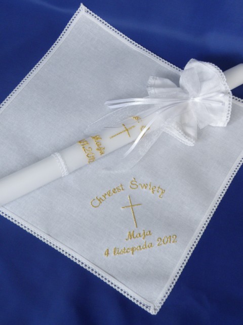 Komplet składa się z haftowanej szatki - białej chusteczki do chrztu, świecy z haftowaną nakładką oraz ozdobnej profitki - okapnika na świecę.
