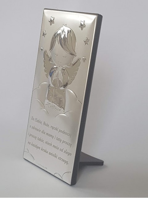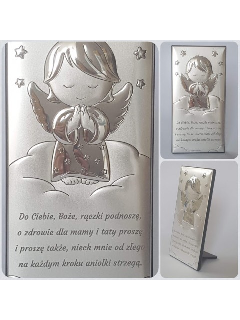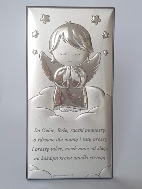 Srebrny obrazek z Aniołkiem i modlitwą 9x18 cm DUŻY